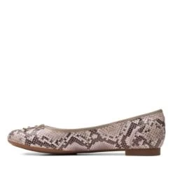 A timeless silhouette, these ballerina style flats have been subtly refined with an ultra-feminine toe shape and bow detailing. Boasting Cushion Soft underfoot these taupe snake effect leather shoes offer cushioning in every step.