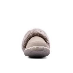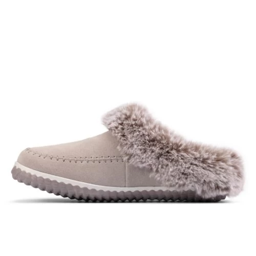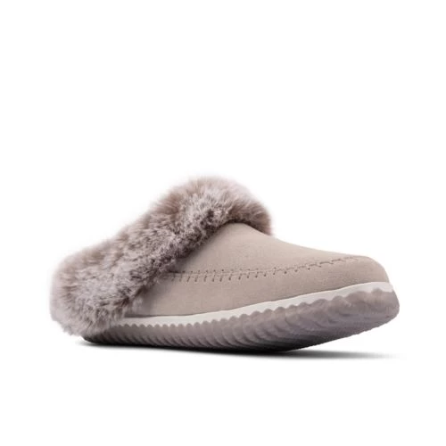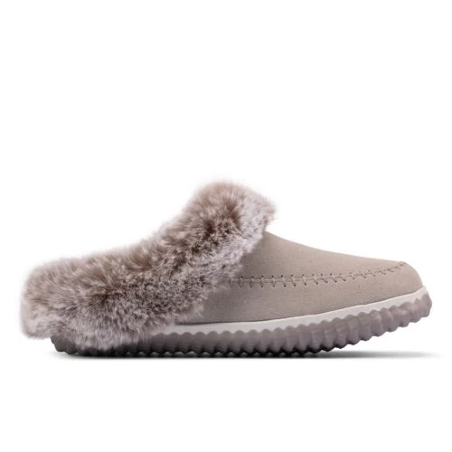 Modern mule slippers, designed in soft grey suede with a cosy faux fur lining and finished with crafted moccasin stitching. The podded rubber sole adds grip for indoor wear. Perfect for gifting.