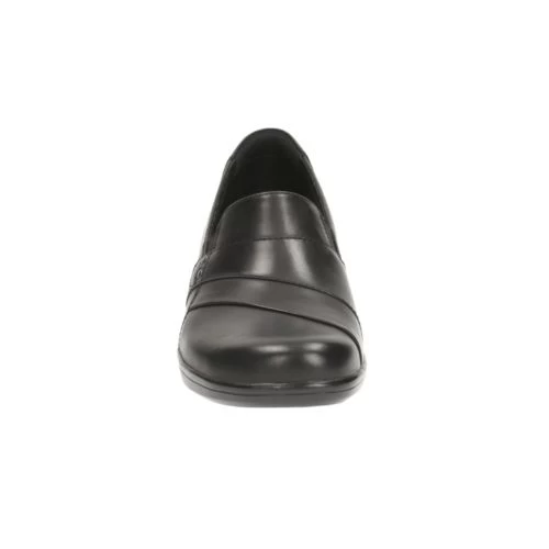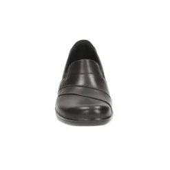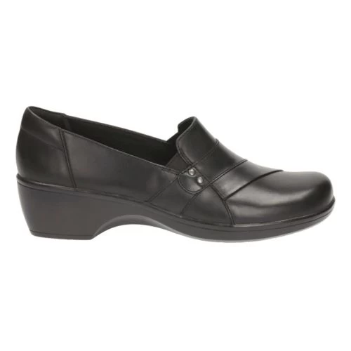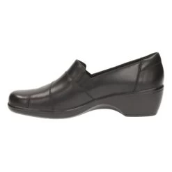 This simple slip-on womens shoe in smooth black leather upper is easy to wear. Attractive crossover detail adds subtle flair.